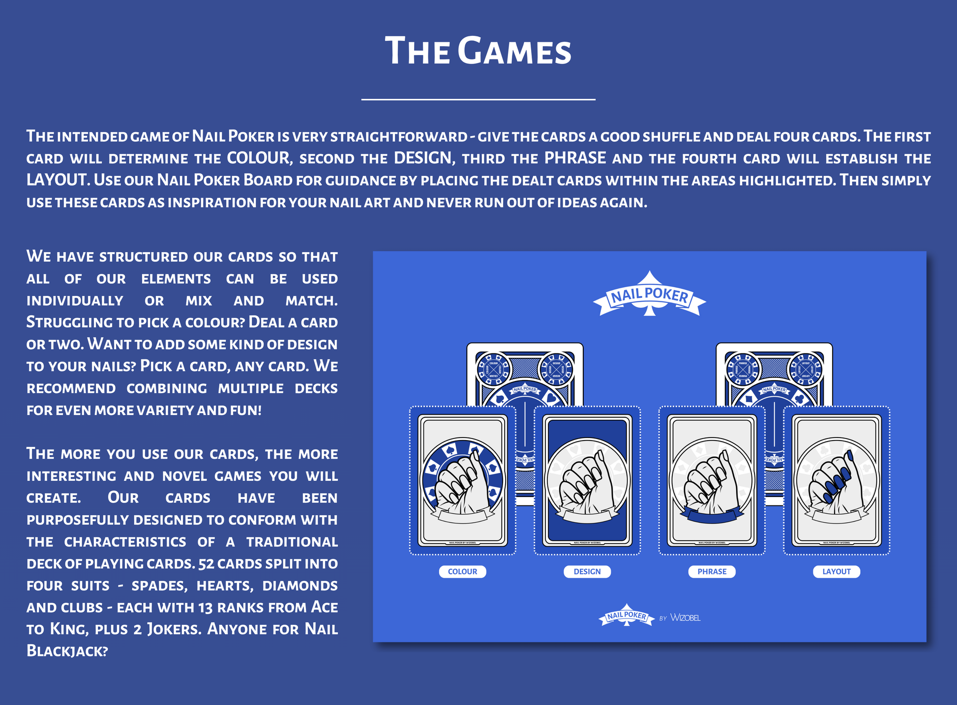 The Nail Poker Blue Deck consists of 54 Nail Poker playing cards that will help you choose your nail colour, design, layout and more. Perfect for inspiration, training and content creation. Includes a free Nail Poker Board in the corresponding colour as well as a Small Storage Box to keep your deck clean and protected. Please handle Nail Poker Board with care. Combine multiple decks for even more variety and fun!