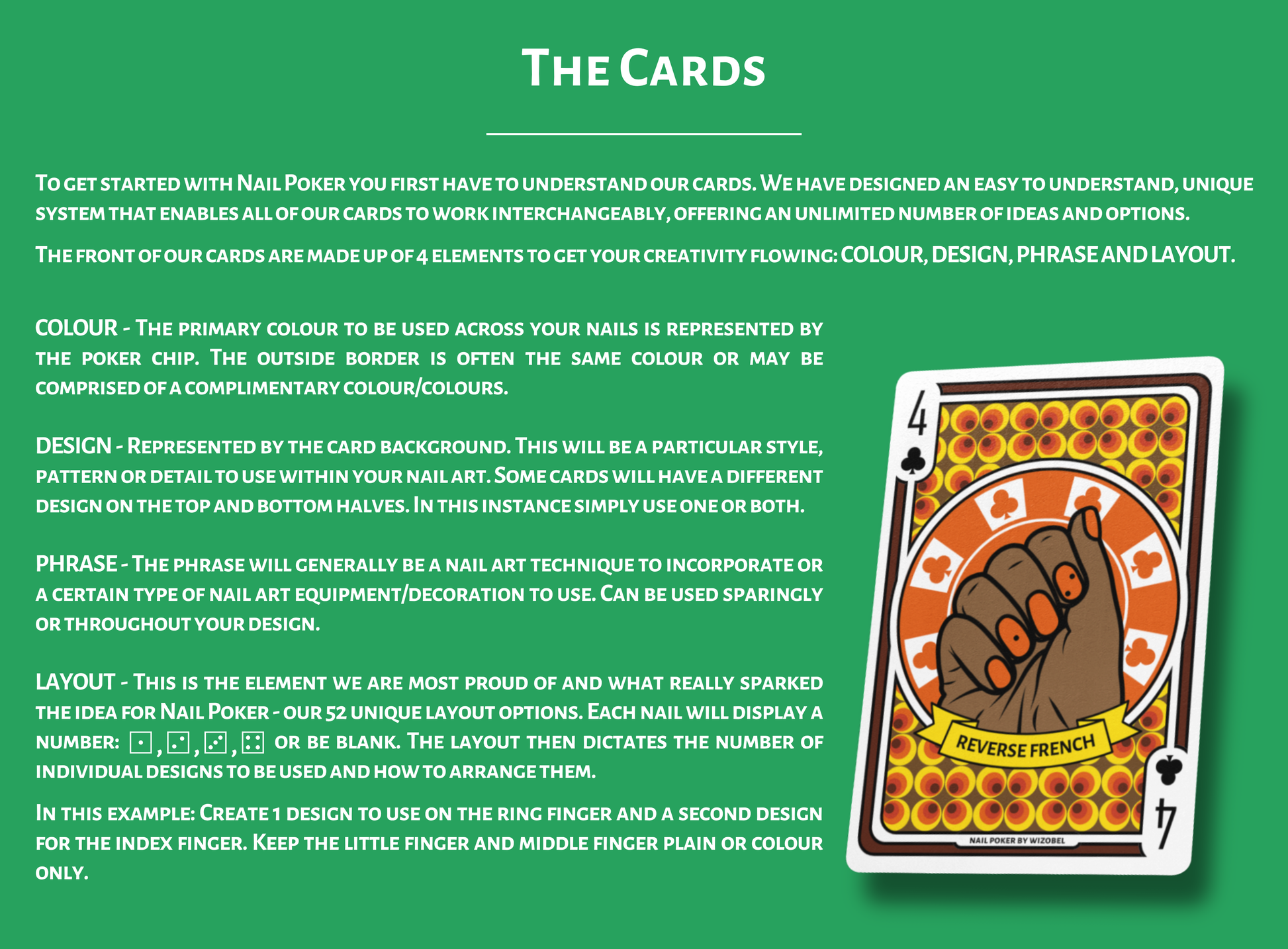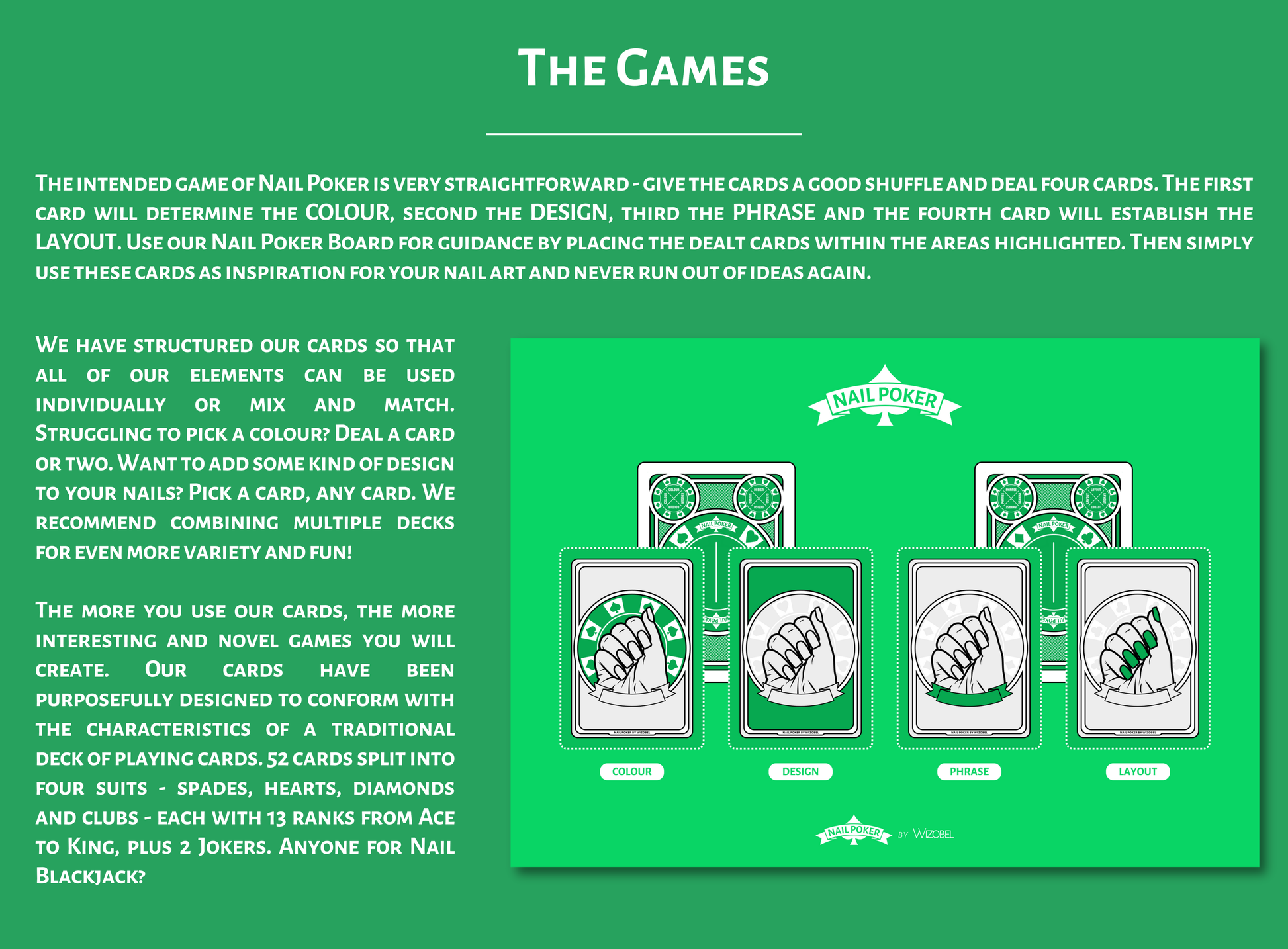 The Nail Poker Green Deck consists of 54 Nail Poker playing cards that will help you choose your nail colour, design, layout and more. Perfect for inspiration, training and content creation. Includes a free Nail Poker Board in the corresponding colour as well as a Small Storage Box to keep your deck clean and protected. Please handle Nail Poker Board with care. Combine multiple decks for even more variety and fun!